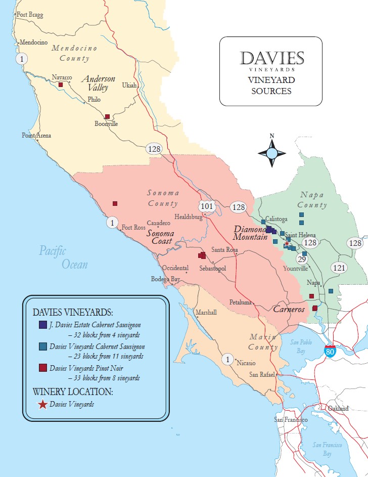 With the popularity of the Pinot Noir project growing, in 2012 the winemaking team broadened their scope once again. They searched out new Napa Valley Cabernet Sauvignon sites for the production of additional still wines. Outstanding sites were found, and new vineyard designated Cabernet Sauvignons were added to the Davies Vineyards line. Each vineyard site provides the winemaking team unique flavor characteristics from the varietal, allowing them the opportunity to produce a wine that is strikingly different than the J. Davies Estate wine, while still delicious and singular to the vineyard from which it came. With the 2012 vintage, the family produced their first Davies Vineyards Cabernet Sauvignons, highlighting Napa Valley vineyards throughout the diverse Napa County. Since this new program began, Davies Vineyards has produced delicious single vineyard Cabernet Sauvignons from Winfield Vineyards, Red Cap Vineyard and Round Pond Vineyards.